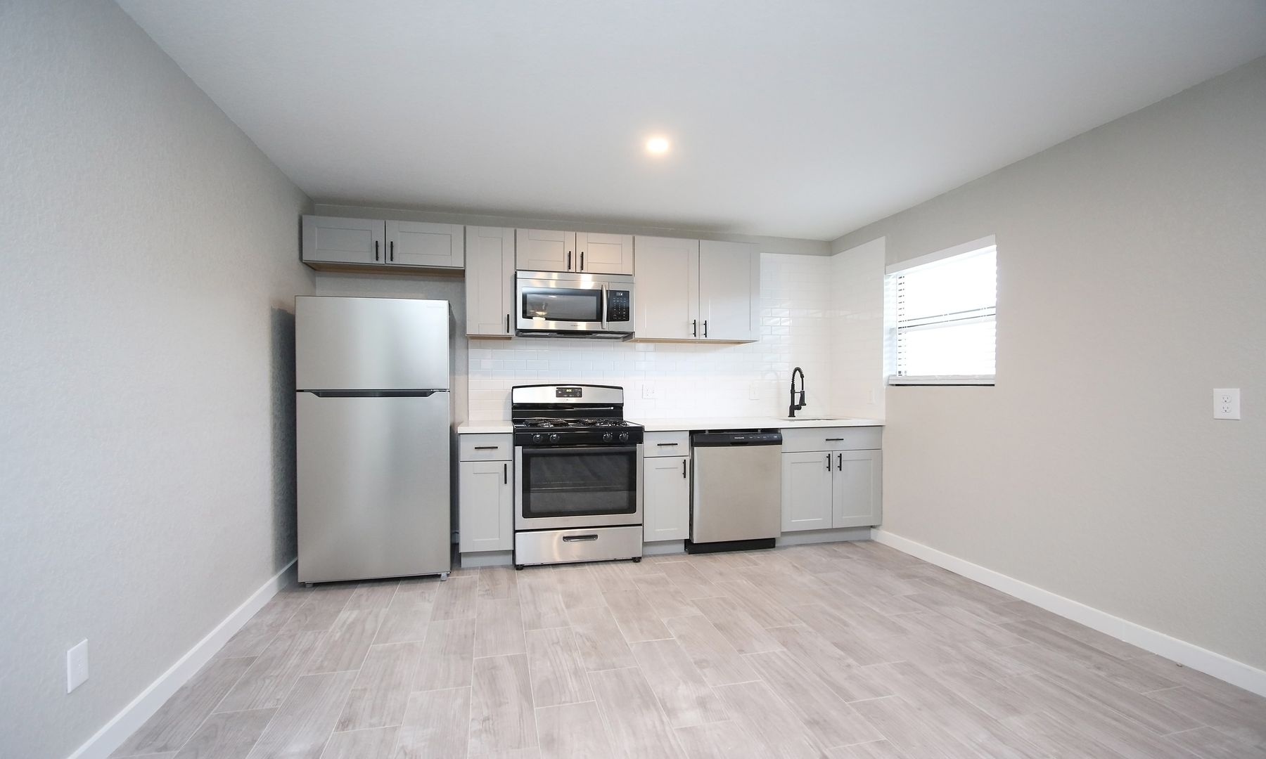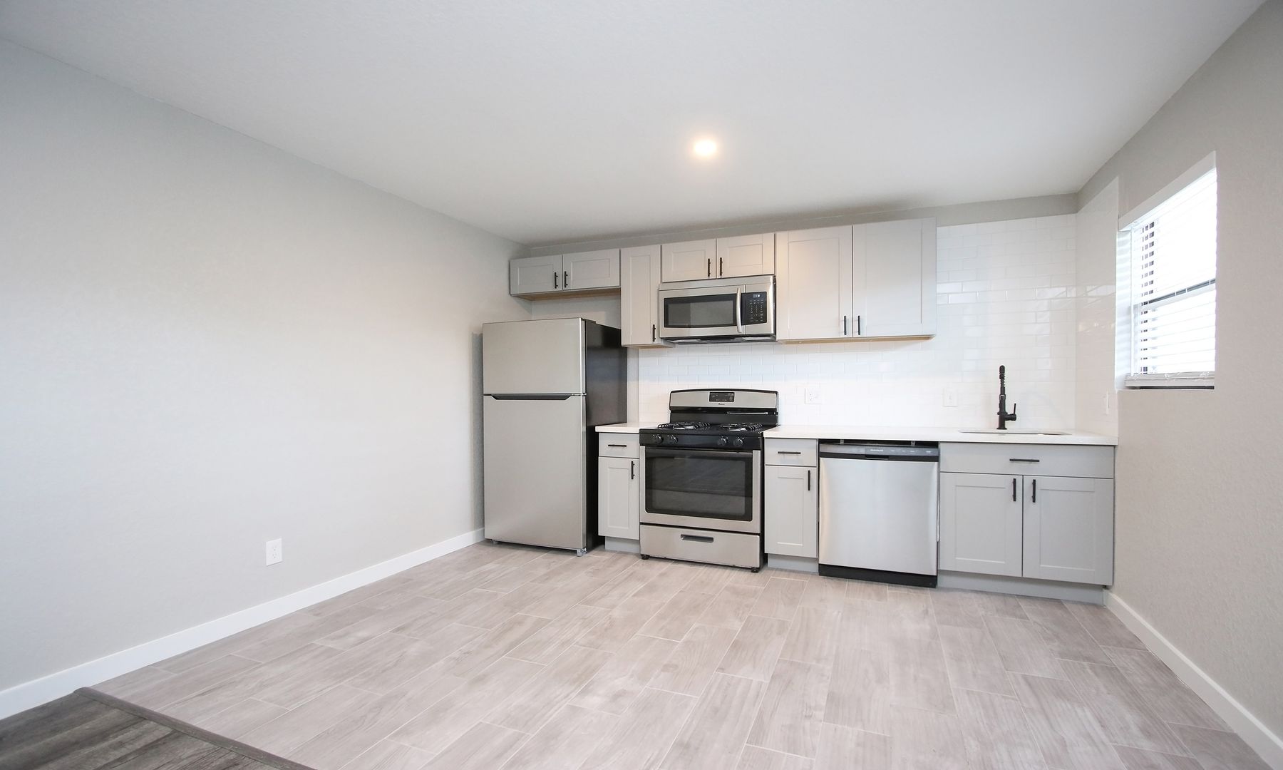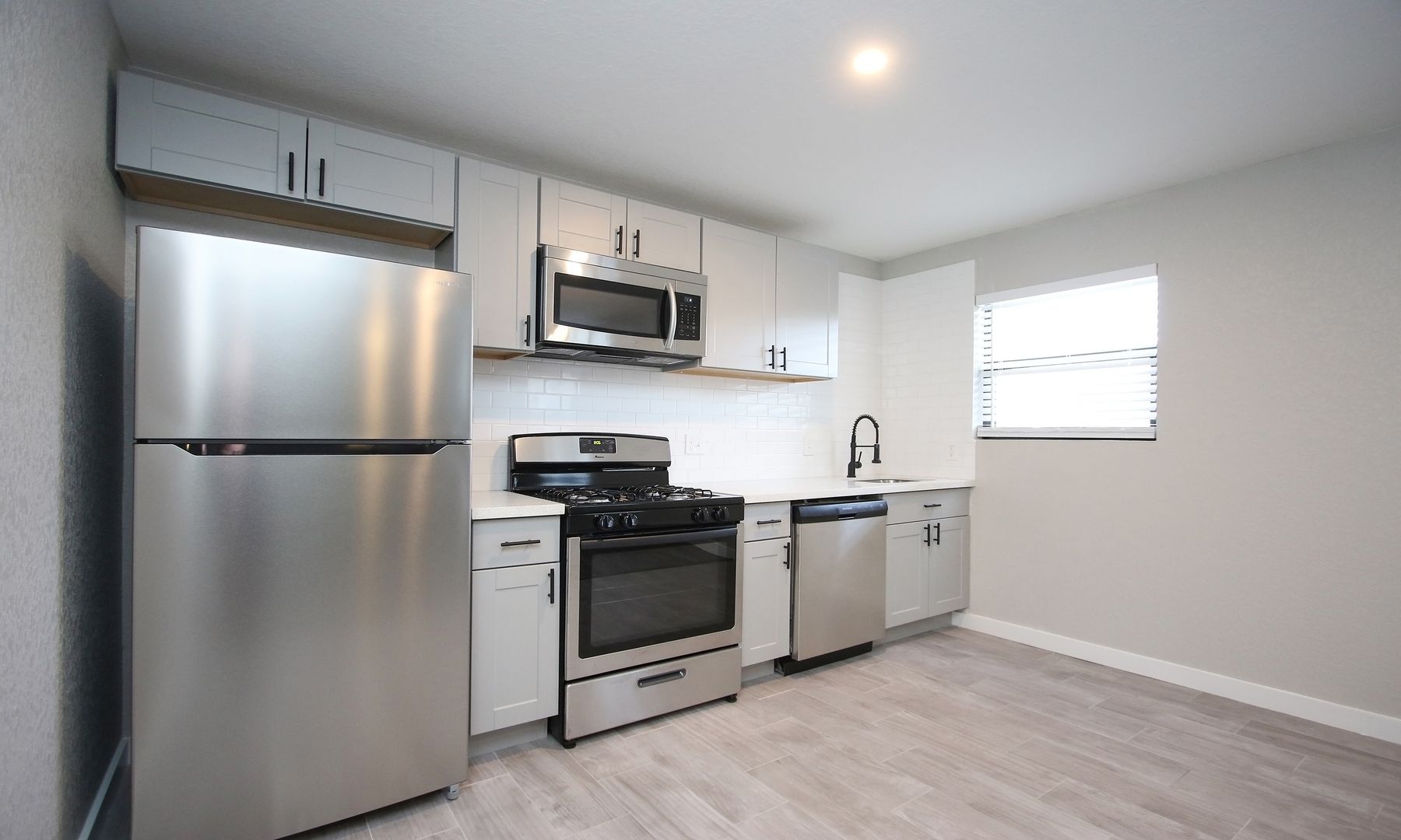 This two bedroom has been completely transformed with beautiful white quartz counters, stainless-steel appliances, and in-unit laundry! Photos of model unit, final finishes may vary.