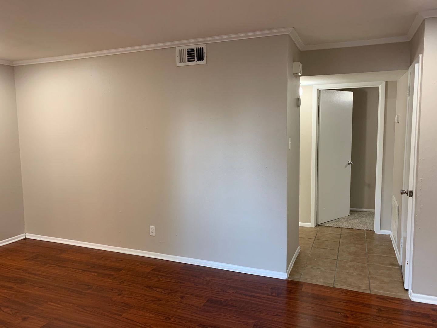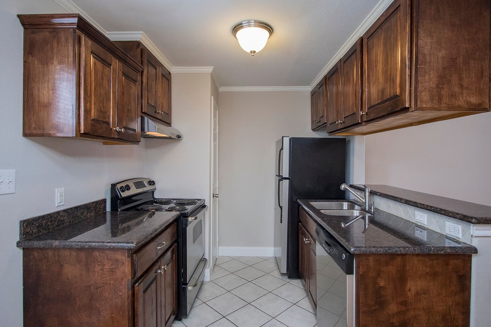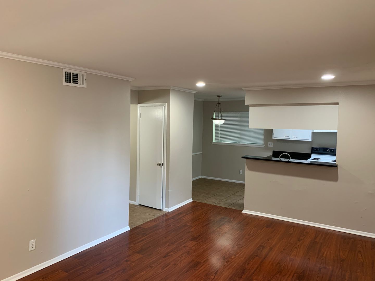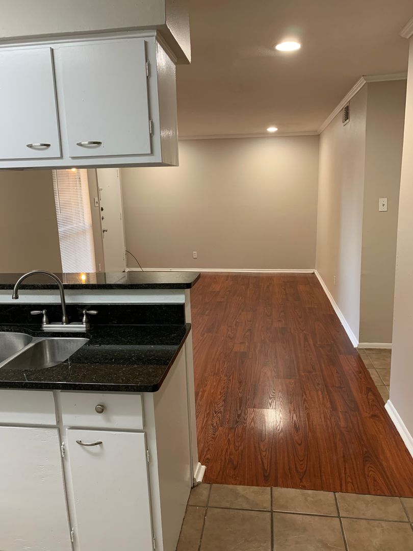 This two bedroom is simple and elegant with granite countertops throughout, wood flooring in the living room and carpet in the bedrooms.